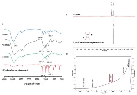 TFSPEI was synthesized by condensing PEI 1.8 kDa and spermine with 2,3,5,6-tetrafluoroterephthaldehyde through imine linkage. First, a few spermines were reacted with 2,3,5,6-tetrafluoroterephthaldehyde to construct an oligomer short chain. Spermine contains intermediate transition link groups that can expose fluorine atoms. After that, an excess of small molecular weight PEI 1.8 kDa was added to the reaction solution, and the oligomeric further reacted with PEI 1.8 kDa using the exposed aldehyde groups at both ends, which not only links all fluorine atoms to the final product but increases the molecular weight and overall charge density. As shown in Figure 2a, the strong absorption peak of 1704 cm−1 in 2,3,5,6-tetrafluoroterephthaldehyde was attributed to the –C=O– bond, while there was no such absorption peak in TFSPEI, indicating that the aldehyde group had been completely reacted. Compared with PEI 1.8 kDa, TFSPEI had an obvious peak of –C=N– at 1640 cm−1, whose characteristic infrared absorption peak range was at 1690~1630 cm−1, indicating the occurrence of the dehydration condensation reaction. The absorption peak of 1383 cm−1 was shown in the spectrum, indicating the presence of the C-F bond.