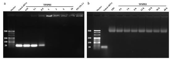 The ability of carriers to condense siRNA into nanoparticles and to avoid genes being degraded before entering cells are prerequisites for gene delivery [34]. As shown in Figure 3a, when the w/w ratio was higher than 1, no electrophoresis strips of siRNA appeared, indicating that TFSPEI could successfully condense and protect siRNA at a low ratio. In addition, the stability of the complex in 10% FB was also tested. Because in a biological environment, the complex works in an environment-containing serum, large amounts of negatively charged substances may bind to the complex and destroy its structure. No siRNA strips appeared in Figure 3b, which shows that TFSPEI polyplex had high stability in FBS and could effectively protect siRNA from leakage within 48 h.