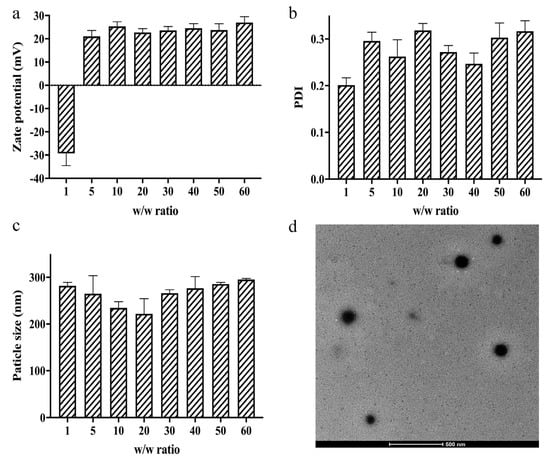 Characterization of TFSPEI polyplexes. (a) Zeta potential, (b) PDI, and (c) particle size of the polyplex. Data are shown as the mean ± S.D. (n = 3). (d) TEM images of the polyplex at the w/w ratio of 50.