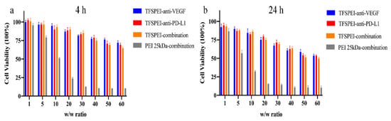 Cell viability of CT26 of four groups (TFSPEI-anti-VEGF polyplex, TFSPEI-anti-PD-L1 polyplex, TFSPEI-combination polyplex, and PEI 25 kDa-combination polyplex) at different w/w ratios (1, 5, 10, 20, 30, 40, 50, 60) incubated for (a) 4 h and (b) 24 h. Data are shown as the mean ± S.D. (n = 6).