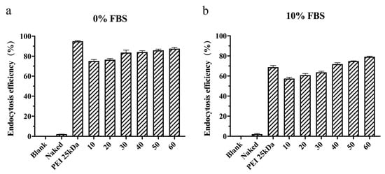 Endocytosis efficiency of TFSPEI polyplex incubated for 4 h at different w/w ratios (10, 20, 30, 40, 50, 60) with (a) 0% FBS and (b) 10% FBS. Data are shown as the mean ± S.D. (n = 3).
