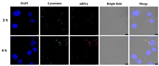 The state of the polyplex after endocytosis was qualitatively observed under confocal laser microscopy (Figure 7). To explore the effect of endocytosis time on endocytosis efficiency, two experimental groups of 2 h and 4 h were set up. Compared with the 2 h group, the number of endosomes and lysosomes labeled with green fluorescence and the polyplex labeled with red fluorescence increased in the 4 h group, and the two superimposed in the same position showed yellow fluorescence. The results indicate that more polyplex successfully entered the acidic organelles at 4 h than at 2 h. In addition, there was no red fluorescence in the nucleus labeled with blue, which proved that the active site of siRNA was the cytoplasm and would not be delivered into the nucleus. These results suggest that the TFSPEI complex can be successfully endocytosed into cells and protect siRNA from degradation.