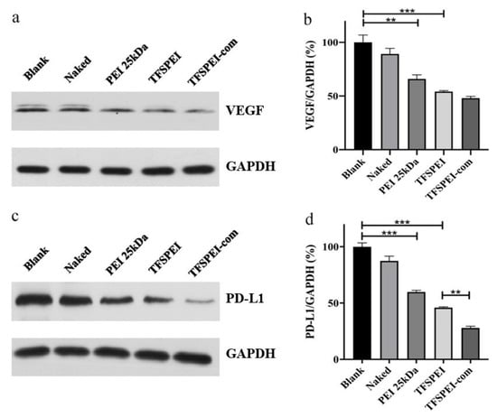 As shown in Figure 8a,b, the protein content of the blank group was regarded as 100%, and the protein content of the naked group showed no significant difference, indicating that naked siRNA was difficult to enter cells autonomously to play a silencing effect. The VEGF protein content in the PEI 25 kDa group and TFSPEI group was significantly decreased, and the inhibition of protein expression in the TFSPEI group was stronger, indicating that the serum stability of TFSPEI polyplex was better in the presence of serum. In addition to the improvement of the antiserum performance of hydrophobic and hydrophilic fluorine-containing groups, the polyplex formed by the fluorine-modified carrier can also maintain a high endosomal escape ability in the serum environment. Compared with the TFSPEI group, there was no significant change in VEGF protein content in the TFSPEI-com group, indicating that there was no relevant pathway for anti-PD-L1 siRNA to synergically inhibit the expression of VEGF protein.