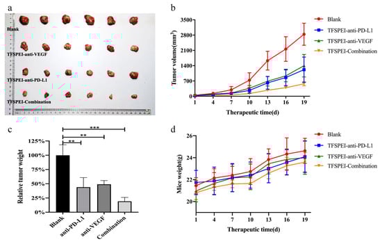 After 3 weeks of administration, the mice were sacrificed and the tumors were extracted. The final tumor growth results in each group are shown in Figure 9a–c. With the prolongation of treatment time, the tumor volume in the blank group increased rapidly, finally growing to about 2800 mm3. Tumor growth was significantly slower in the treatment group, and the TFSPEI-Combination group was the slowest. The tumor volume growth trend of the TFSPEI-anti-VEGF group and the TFSPEI-anti-PD-L1 group was similar. It shows that the TFSPEI polyplex can effectively inhibit tumor growth and the therapeutic effect of simultaneously delivering anti-PD-L1 siRNA and anti-VEGF siRNA was better than that of a single siRNA. Taking the average weight of the tumor in the blank group as 100%, the tumor weight in the TFSPEI-combination group was the lowest, only about 25% of the blank group. In Figure 9d, with the increase of treatment time, the bodyweight of mice in each group increased continuously, and the overall trend was consistent, with little difference in body weight. The body weight growth curve of the mice indicated that the drug administration did not affect the growth state of the mice, and the TFSPEI polyplex used in the experiment had good biocompatibility and safety.