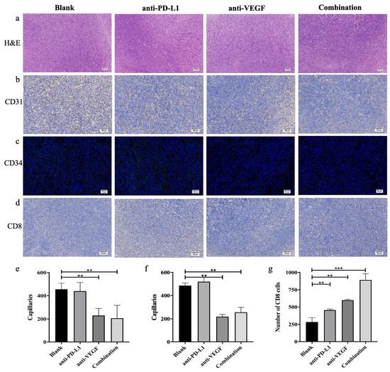 According to the H&E staining of tumor tissue in Figure 10a, the color and morphology of tumor tissues in each group were consistent without significant difference, and the cell growth was dense and vigorous. The results indicate that the tumor types in each group are consistent and no abnormal tumor tissue exists. CD31 and CD34, as the markers of endothelial tissue differentiation, can be used to evaluate tumor angiogenesis [49,50]. As shown in Figure 10b,c, the nuclei were marked blue, the CD31-positive areas were marked dark brown, and CD34-positive areas were marked green. There were many positive signals in the blank group and the TFSPEI-anti-PD-L1 group, and the overall distribution was uniform and dense, indicating that there were more new blood vessels and vigorous tumor growth. The positive signal density was significantly reduced in the TFSPEI-anti-VEGF group and the TFSPEI-combination group, and the difference between the two groups was not significant. These results show that anti-VEGF siRNA delivered by TFSPEI can effectively inhibit tumor angiogenesis, and there is no relevant pathway for anti-PD-L1 siRNA to synergically inhibit the expression of VEGF protein. Image-Pro Plus was used for semi-quantitative analysis of the number of blood vessels, and the average number of new blood vessels was consistent with the above observations (Figure 10e,f).