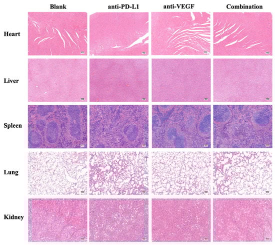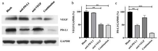 In most malignant tumors, continuous angiogenesis is regarded as an important tumor marker [5,6]. Among the factors promoting tumor angiogenesis, VEGF has been proved to be the most important, which can stimulate the growth of vascular endothelial cells and hinder the effective delivery of anti-tumor drugs to tumor tissues [7,8,9]. In recent years, many studies have shown that VEGF can also induce the proliferation and differentiation of regulatory cells and myeloid-derived suppressor cells, inhibit the maturation of dendritic cells (DCs), and induce the expression of immunosuppressive molecules PD-L1 in DCs, thereby inhibiting the body’s immune response to tumor cells [10,11,12,13,14]. In addition, PD-L1 is highly expressed in tumor cells and tumor-associated activating antigen-presenting cells, and programmed cell death protein 1 (PD-1) is highly expressed in tumor-infiltrating lymphocytes under long-term stimulation of tumor antigens [15]. The combination of PD-L1 and PD-1 can induce T cell apoptosis and exhaustion, inhibit the activation, proliferation, and anti-tumor function of tumor antigen-specific CD8-positive T cells and realize the immune escape of tumor cells [16,17,18]. Therefore, the combined inhibition of PD-L1 and VEGF expression can effectively activate the immune response, promote the tumor infiltration effect of T cells, and inhibit tumor angiogenesis, making it an ideal target for combined therapy [10,19].