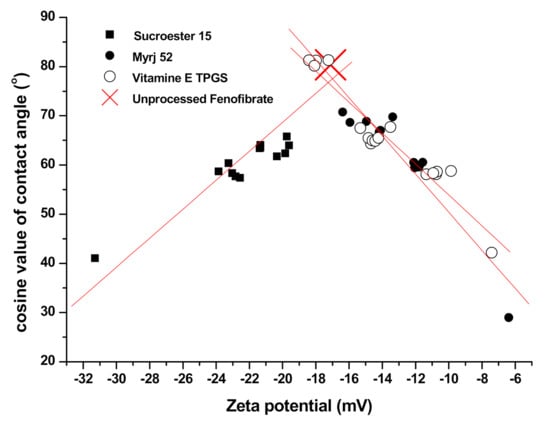 - Dahlberg, C.; Millqvist-Fureby, A.; Schuleit, M. Surface composition and contact angle relationships for differently prepared solid dispersions. Eur. J. Pharm. Biopharm. 2008, 70, 478–485. [Google Scholar] [CrossRef] [PubMed]