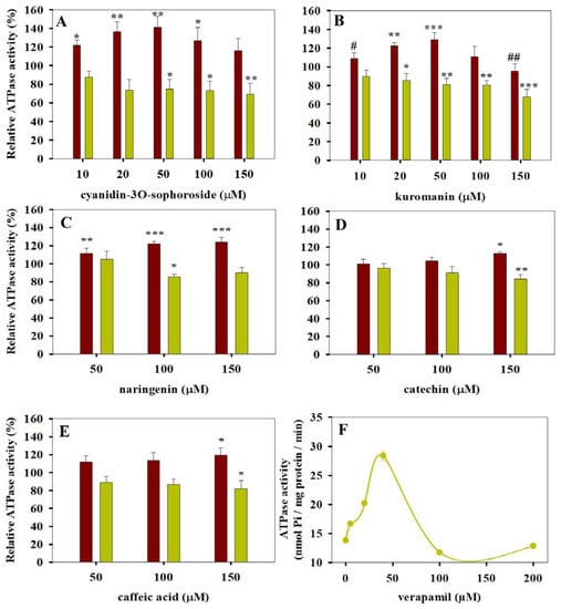 Polyphenols that increase the basal and decrease the verapamil-stimulated ATPase activity of Pgp (A–E). The effect of polyphenols on the basal and substrate-stimulated ATPase activities of Pgp were measured in the absence (red bars) or in the presence (yellow bars) of 40 µM verapamil, respectively (A–E). An amount of 40 µM verapamil induced the maximal stimulation of the Pgp-specific ATPase activity in NIH 3T3 MDR1 membrane samples (F). Relative Pgp-specific ATPase activities were calculated compared with the polyphenol-untreated samples. Bars represent the means (±SD) of three independent measurements each performed in triplicates. Significant differences compared with the polyphenol-untreated samples are shown by ***: p < 0.001, **: p < 0.01, *: p < 0.05. Significant differences relative to the 50 µM kuromanin-treated cells are indicated by ##: p < 0.01, #: p < 0.05.