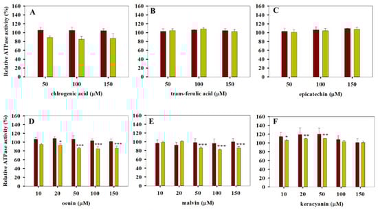 On the other hand, the rest of the tested compounds such as chlorogenic acid, trans-ferulic acid, malvin and oenin did not have a statistically significant effect on the basal ATPase activity of Pgp (see Figure 3). Interestingly, epicatechin (Figure 3C) also belongs to this inactive subgroup of polyphenols, while its stereoisomer catechin stimulated the basal activity and decreased the verapamil-stimulated ATPase activity of Pgp when it was applied at 150 µM concentration (see Figure 1D). Oenin and malvin slightly decreased the verapamil-stimulated ATPase activity of Pgp (Figure 3D,E). Generally, the tested polyphenols decreased or did not affect the verapamil-stimulated ATPase activity of Pgp (see Figure 1, Figure 2 and Figure 3) except for keracyanin, which induced a slight increase when it was applied at 10 to 50 µM concentrations (Figure 3F).