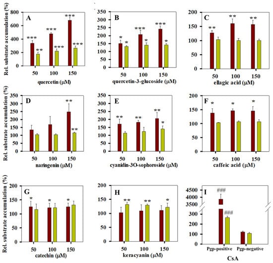 Polyphenols that decrease the transport activity of Pgp in calcein (red bars) and daunorubicin (yellow bars) accumulation experiments (panels (A–H)). The effect of 10 µM cyclosporine A (CsA) on the calcein and daunorubicin uptake by Pgp-positive and Pgp-negative cells (panel (I)). Cells were pre-treated with polyphenols (panels (A–H)) or CsA (panel (I)) for 10 min at 37 °C, and then they were stained with fluorescent Pgp substrates (0.5 µM calcein-AM or 3.8 µM daunorubicin) for 20 min and 30 min, respectively. The intracellular accumulation of calcein and daunorubicin was measured in a flow cytometer. The relative substrate accumulation was calculated by normalizing the mean calcein or daunorubicin fluorescence intensities of the CsA/polyphenol-treated samples to the CsA/polyphenol-untreated control samples and expressed as a percentage (%). Bars represent the means (±SD) of at least three independent measurements. Significant differences compared with the untreated samples are shown by ***: p < 0.001, **: p < 0.01, *: p < 0.05. In panel I, significant differences compared with the Pgp-negative cells are shown by ###: p < 0.001.