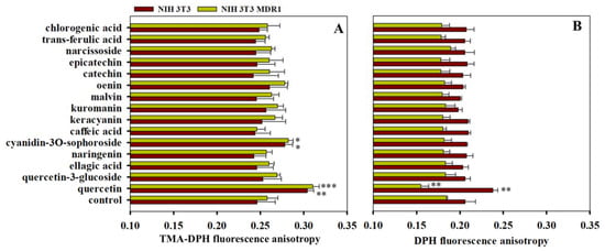Effects of polyphenols on the steady-state fluorescence anisotropy of TMA-DPH (A) and DPH (B) in Pgp-positive (yellow bars) and Pgp-negative (red bars) NIH 3T3 cells. Cells were pre-treated with polyphenols applied at 50 µM concentration for 10 min at 37 °C and then further incubated with 2 µM DPH or TMA-DPH for another 20 min. Fluorescence anisotropy values were measured at 37 °C. Bars represent the means ± SD of at least three independent experiments performed in triplicates. Significant differences compared with the polyphenol-untreated control samples are shown by ***: p < 0.001, **: p < 0.01, *: p < 0.05.
