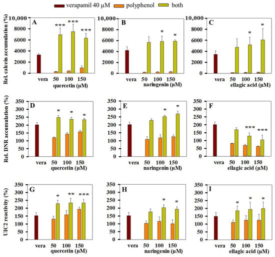 Effects of verapamil–quercetin (A,D,G), verapamil–naringenin (B,E,H) and verapamil–ellagic acid (C,F,I) combinations on the intracellular accumulation of calcein (A–C) or daunorubicin (D–F) and on the UIC2 reactivity (G–I) of NIH 3T3 MDR1 cells. Samples were pre-incubated in the presence or absence of 40 µM verapamil (vera) and/or polyphenols for 10 min at 37 °C and then stained with calcein-AM, daunorubicin or UIC2-A647, as it is described in detail in the Materials and Methods section. Bars represent the means (±SD) of at least three independent measurements. Significant differences compared with the only-verapamil-treated samples are shown by ***: p < 0.001, **: p < 0.01, *: p < 0.05.
