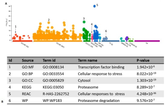 To obtain the enrichment information for the 85 candidate targets showing QTLs, g:Profiler analysis was performed [36]. The default analysis implemented in g:Profiler searches for pathways whose genes are significantly enriched (i.e., over-represented) in the target list of interest and compares them to all genes in the genome. Among the most significant pathways detected by REAC, “cellular response to stress” (p-value = 4.2 48 × 10−36) and “cellular responses to external stimuli” (p-value = 1. 326 × 10−35) have been pointed out, consistent with OS being the investigated disease phenotype (Figure 2). “Proteasome” (p-value = 8. 289 × 10−7) and “proteasome degradation” (p-value = 9. 576 × 10−7) have been identified as the most represented pathways by KEGG and WP, respectively. The three most significant cellular functions outlined by GO were “transcription factor binding” (GO:MF, 1. 942 × 10−6), “cellular response to stress” (GO:BP, 8. 022 × 10−19) and “cytosol” (GO:CC, 1. 303 × 10−19). Table S9 gives details of all the individual targets involved in the described analyses.