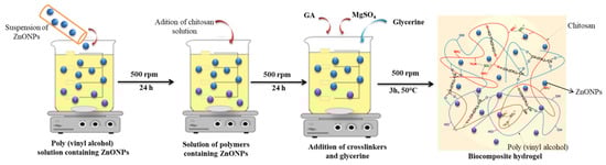 Among all types of hydrogels, hydrogels from natural polymers (chitosan, dextran, gelatin, and hyaluronic acid) have great potential in medicine because of their biocompatibility, biodegradability, mechanical properties, bioresorption ability, and relatively low cost []. On the other hand, the synthetic polymers present a high chemical purity, reproducible synthesis process, controllable degradation rate, very good mechanical properties, and an important advantage to achieve a sustained release of the therapeutic agents over a longer period of time in comparison with the natural ones [,]. Hydrogels based on chitosan (CS) and poly (vinyl alcohol) (PVA) containing zinc oxide nanoparticles (ZnONPs) have already been studied in the literature by the freezing-thawing cycle [,] or solution casting method [], but to the best of our knowledge, there are no studies on the obtaining of this type of biocomposite hydrogel using the double crosslinking method. In this context, the novelty of our study consists in the development of a new antibacterial biocomposite hydrogel based on CS and PVA containing ZnONPs using the double crosslinking method in order to reduce the quantity of the potential toxic covalent crosslinking agents.