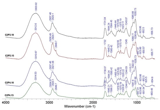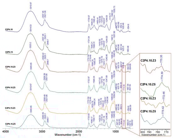 The obtained results confirmed, on the one hand, the reaction between the amino functional groups from CS and the hydroxyl functional groups of PVA with the covalent crosslinker (GA), and on the other hand, the reaction between the amino functional groups from CS with the SO42− groups of the ionic crosslinker (MgSO4). The characteristic peaks located around 3314, 3310, 3312, and 3303 cm−1, respectively, that were found in the spectrum from Figure 2, and peaks located between 3305 and 3323 cm−1 in the spectrum from Figure 3 can be attributed to vibration stretching of secondary amine groups (NH) from CS or hydroxyl groups (OH) from PVA that are involved in the intra- and intermolecular bonds of hydrogen [,]. The absorption bands at about 2849 cm−1 and those between 2920 and 2940 cm−1 (Figure 2 and Figure 3) correspond to the C-H bonds in the alkyl groups. In the case of samples with a higher amount of GA (C2P2.15, C2P4.15, C2P4.15.Z3, and C2P4.15.Z5), there is an intensification of the peak observed at 2849 cm−1. Absorption bands around 1732 cm−1, which are found in the spectra of all analyzed samples, can be associated with the stretching vibration of the —C=O group in PVA []. The peaks noticed for all the analyzed samples at 1629–1646 cm−1 can be attributed to the imine group (C=N), which is proof of the covalent crosslinking between GA and CS. The intense peak located at approximately 1590 cm−1 indicates the presence of amine groups (NH2) specific for a polysaccharide structure []. The absorption bands at 1035–1040 and 1082–1088 cm−1 can be attributed to the acetal groups (C-O-C) formed by crosslinking of PVA with GA. The presence of ZnONPs into hydrogels was confirmed by the appearance of the peak at approximately 774 cm−1, which corresponds to the ZnO stretching vibration []. The absorption peaks ranging from approximately 654 to 667 cm−1 that are found in the spectra of all analyzed samples can be attributed to the SO42− group, which evidenced the ionic crosslinking between the functional groups of CS with MgSO4 [].
