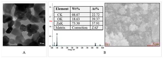 Transmission electron microscopy (TEM) (A) and EDAX spectrum (B) for ZnONPs.