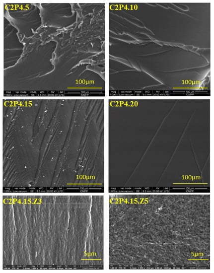 The increased concentration of GA led to increased mechanical properties, but when ZnONPs were incorporated into the hydrogels, the tensile strength and elongation at break decreased compared with the sample without metal oxide NPs. The higher effect was observed for the C2P4.15.Z3 sample, but with a further increase of the ZnONPs concentration, the mechanical properties were improved. However, the hydrogels with ZnONPs had a lower modulus of elasticity, compared with the sample without metal oxide NPs.
