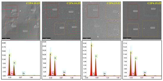 EDAX spectrum for samples C2P4.10.Z3, C2P4.10.Z5, C2P4.15.Z3, and C2P4.15.Z5.