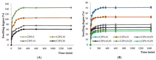 It should also be mentioned that after 6 h, all the samples reached the maximum swelling degree. In fact, between 6 and 24 h, there were no changes in the samples’ swelling degree as can be seen in Figure 7.