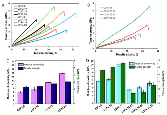 Tensile stress–strain curves for C2P2 and C2P4 series (A) and for C2P4.15 sample with and without ZnONPs (B). Variation of the modulus of elasticity and tensile strength for the C2P2 series (C) and C2P4 series (D).