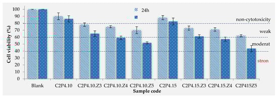 In vitro cell viability of C2P4.10 and C2P4.15 hydrogels obtained in the absence and in the presence of ZnONPs at 24 and 48 h after incubation.