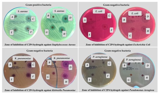 Agar disk-diffusion testing is the method used in some clinical microbiology laboratories for routine antimicrobial susceptibility testing []. This method was also used in this study in order to evaluate the antimicrobial activity for the hydrogels based on CS and PVA, obtained in the absence and in the presence of ZnONPs. Typical reference strains of S. aureus (Gram-positive bacteria) and E. coli, K. pneumoniae, and P. aeruginosa (Gram-negative bacteria) were used for these tests (Figure 10). Four samples were placed on each agar plate: the hydrogels without ZnONPs (A-C2P4.10 or B-C2P4.15) and three hydrogel samples with different concentrations of ZnONPs (3% ZnONPs for E-C2P4.10.Z3 or G-C2P4.15.Z3; 4% ZnONPs for F-C2P4.10.Z4 or H-C2P4.15.Z4; 5% ZnONPs for C-C2P4.10.Z5 or D-C2P4.15.Z5).