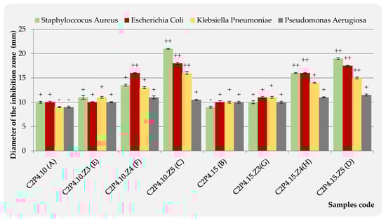 The diameter of the inhibition zone (diz), obtained after 24 h of incubation at 37 °C, was transcribed as “−” when no antimicrobial effect was noticed, “+” when the diz is <15 mm, and “++” when the diz is between 15 and 25 mm []. These results are presented in Figure 10.