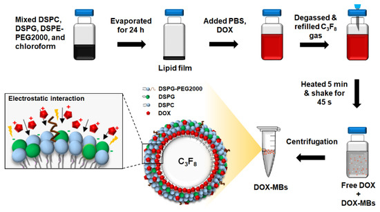 Each material was dissolved homogeneously in chloroform and eliminated using an evaporator (R-210, Büchi Labortechnik AG, Flawil, Switzerland) to form a thin film (Figure 1). A 0.5 wt% glycerol containing phosphate-buffered saline (PBS) was mixed with the film and dispersed with a sonicator (Model 2510, Branson Ultrasonics Corp., Danbury, CT, USA) at 60 °C. A total of 1500 μg DOX was mixed into the lipid solution for 1 h at 60 °C because MBs hardly formed when more than 1500 μg DOX was added (data not shown). Subsequently, the mixture was degassed and refilled with perfluoropropane (C3F8). Finally, DOX-MBs were formed by agitation at 4550 rpm for 45 s. To remove the unreacted DOX and lipids, the DOX-MBs were centrifuged at 500× g for 2 min and washed four times with 0.5 wt% glycerol-PBS. Comparable MBs without addition of DOX were prepared for comparison.