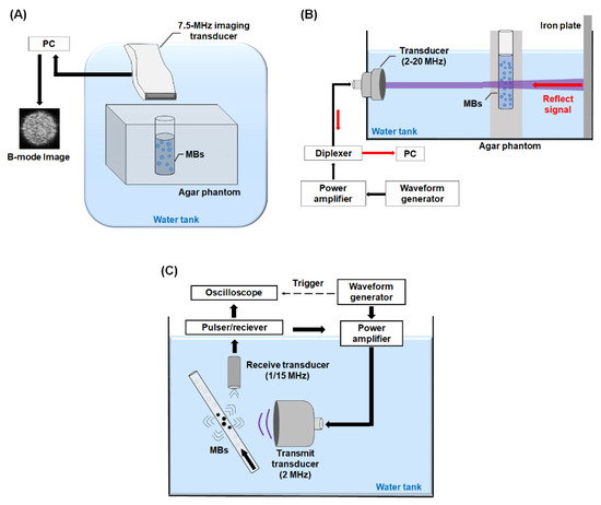Experimental setup for measuring (A) acoustic stability, (B) resonance frequency, and (C) cavitation activities of DOX-MBs.