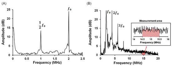 To measure inertial cavitation activities, the receiving transducer was replaced with a 15 MHz focused US transducer (V319, Olympus). The wideband signal within spectra indicated the occurrence of inertial cavitation. The inertial cavitation dose was calculated as the area within the bandwidth of the received transducer (about 14.5–15.5 MHz) [23], but excluded the transducer’s harmonic and ultraharmonic frequencies (Figure 3B).