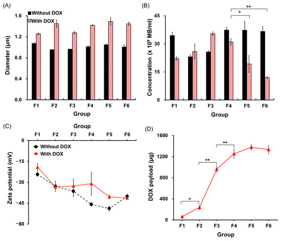 (A) Diameter, (B) concentration, and (C) zeta-potential for each MB formulation with and without DOX loading. (D) DOX payload of each MB formulation. (*, p < 0.05; **, p < 0.005; n = 3 for each test).
