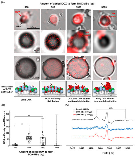 (A) Confocal microscopic images of DOX-MBs with DOX payload from 0 to 3000 μg; n = 5. (B) The quantitative uniformity of DOX on MBs shell; n = 5. (C) The lipid fluidity of DOX-MBs with DOX payload of 0, 500 μg and 1500 μg measured by EPR; n = 1. (**, p < 0.005).