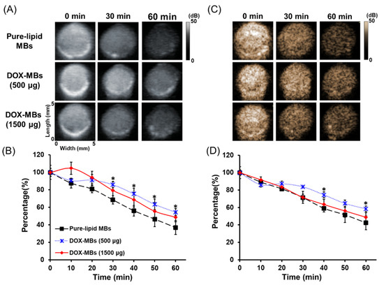 Acoustic stability of pure-lipid MBs and DOX-MBs. (A) Ultrasound B-mode images of pure-lipid MBs and DOX-MBs at different time points. (B) The corresponding quantitative data. (C) Ultrasound contrast enhancement images of pure-lipid MBs and DOX-MBs at different time points. (D) The corresponding quantitative data (*, p < 0.05; n = 3 for each test).