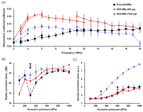 Figure 7A demonstrates the resonance frequency of pure-lipid MBs and DOX-MBs. For pure-lipid MBs, high attenuation coefficients were obtained in the frequency range of 12–14 MHz, showing that pure-lipid MBs had a peak resonance frequency at this region. For DOX-MBs, the major attenuation appeared at 5–7 MHz. However, there was no significant difference between the two doses, and further increasing the dose of DOX did not further reduce the resonance frequency of MBs. Because the resonance frequency of MBs was dominated more by their size than by their shell properties, it is reasonable that the resonance frequency of pure-lipid MBs (mean size: 1.1 ± 0.1 μm) was higher than that of DOX-MBs (mean size: 1.3 ± 0.1 μm for 500 μg group and 1.4 ± 0.1 μm for 1500 μg group).