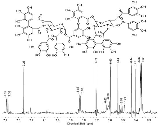 Agrimoniin consists of two pedunculagin residues attached to carbon atoms at C-1 of glucose molecules through dehydrodigallic acid (Figure 1). Figure 1 shows a fragment of the 1H NMR spectrum (200 MHz, CD3OD) of aromatic and two H-1 protons of the resulting compound for the purpose of its identification. The specificity of the spectrum was determined by comparing the values of chemical shifts and the interaction constants of signals of eleven aromatic and two H-1 glucose protons of the resulting agrimoniin with the corresponding literature data [29]. The content of agrimoniin in the substance was determined by the NMR method. Fellamurin (basic substance content 99.0%) was used as an internal standard. The values of the integrals of agrimoniin protons were compared at 7.26 ppm (singlet, 1H) and protons of the methyl group of the standard (1.59 ppm, singlet, 3H). The calculations were carried out as described in the State Pharmacopoeia of the Russian Federation. XIV edition [https://pharmacopoeia.ru/ofs-1-2-1-1-0007-15-spektroskopiya-yadernogo-magnitnogo-rezonansa/] (accessed on 20 November 2021). According to calculations, the content of agrimoniin in the resulting substance reached 80%. The dominant impurities are sugars (range 3.2–4.2 ppm).