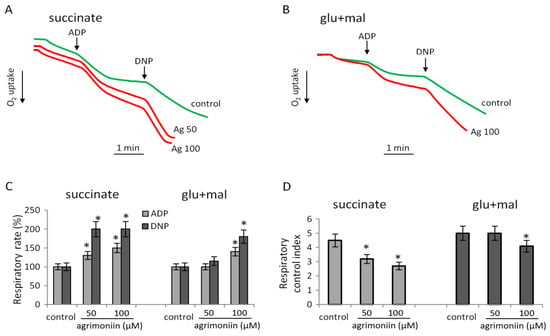 Influence of agrimoniin on respiration during oxidation of succinate and NAD-dependent substrates. Respiration supported by succinate (5 mM) oxidation (A) and glutamate (4 mM) plus malate (2 mM) oxidation (B) in control and in the presence of agrimoniin (50–100 µM); effect of agrimoniin in different concentrations on respiration rates in ADP (200) and DNP (50 µM) –stimulated states (C); respiratory control index (D). The respiratory control index was calculated as the ratio of respiration in the course and after ADP phosphorylation. Asterisk (*) indicates values that differ significantly from the control values (p < 0.05).