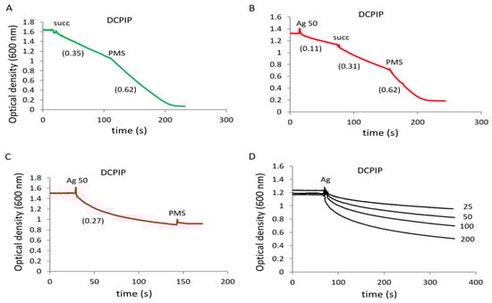 The SDH activity was measured by reducing the electron acceptor DCPIP after successive additions of succinate and the intermediate electron carrier PMS. The acceptor reduction occurred in response to succinate addition and was accelerated with the addition of PMS (Figure 3A). In the presence of agrimoniin, DCPIP reduction was observed in the absence of the substrate and was activated after the addition of succinate and PMS (Figure 3B).