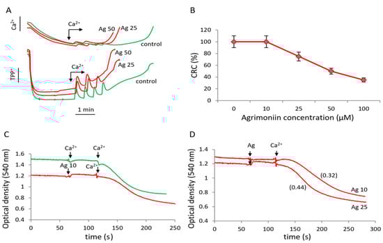 Influence of agrimoniin on MPTP opening induced by calcium ions. (A)influence of agrimoniin (Ag) on membrane potential (lower curves) and induction of calcium efflux (upper curves) in the course successive CaCl2 additions of 25 µM each in the control (green curves) and after agrimoniin (25 µM and 50 µM) additions (red curves). (B)calcium retention capacity (CRC)decreased by agrimoniin at different concentrations; the data represent the average values from five experiments. (C) induction of mitochondrial swelling by calcium ions in the control (green curve) and in the presence of 10 µM agrimoniin (red curve). (D) swelling rates in the presence of 10 µM and 25 µM agrimoniin. Swelling rates are indicated in parentheses.