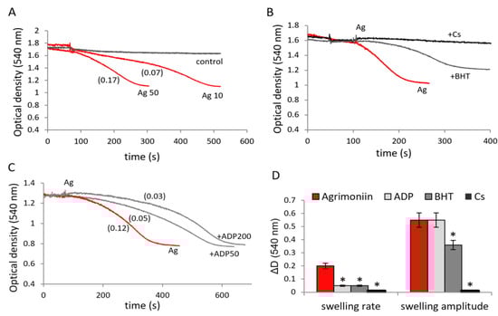 Induction of the mitochondrial swelling by agrimoniin and the influence of MPTP inhibitors. Induction of the swelling of mitochondria by additions of 10 µM and 50 µM agrimoniin (A); the influence of butyl-hydroxytoluene (BHT, 10 µM), cyclosporine A (Cs, 2 µM) (B) and ADP (50 and 200 µM) (C) on the induction of swelling by agrimoniin; D influence of inhibitors on the rate and amplitude of the swelling induced by agrimoniin (D). Swelling rates (ΔD/min) are indicated in parentheses. Asterisk (*) indicates values that differ significantly from the control values (p < 0.05).