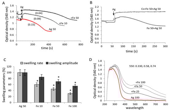 Influence of agrimoniin on the mitochondrial swelling in the presence of iron ions. Swelling of mitochondria induced by agrimoniin (50 µM) in the presence of 10 µM and 50 µM FeSO4 (A); inhibition of swelling induced by agrimoniin + iron (B); swelling rates (ΔD/min) and swelling amplitude (ΔD) during the combined additions of 50 µM agrimoniin and iron ions at different concentrations (C); changes in spectral characteristics of agrimoniin after addition of iron (D). Swelling rates (ΔD/min) are indicated in parentheses. Asterisk (*) indicates values that differ significantly from the control values (p < 0.05).