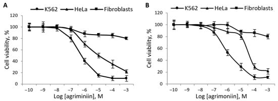 Agrimoniin induced a concentration-dependent cytotoxic effect on these cancer cell lines (Figure 7). With 48-h incubation, agrimoniin IC50 were 1.4× 10−6 M and 1.29 × 10−5 M for K562 and HeLa cells, respectively (Figure 7A). With 72-h incubation, agrimoniin IC50 were 9.1 × 10−7 M and 9.6 × 10−5 M for K562 and HeLa cells, respectively (Figure 7B). In fibroblasts, no pronounced cytotoxic effect was observed over the entire concentration range of agrimoniin; maximum 20% inhibition of cell viability was reached at about 1 mM (Figure 7).