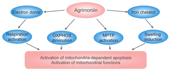Scheme 1 summarizes the properties and mitochondrial effects of agrimoniin, which have been identified in our study. It is important to emphasize that all these effects manifest themselves convincingly even at low concentrations of agrimoniin. This influence on mitochondria can stimulate apoptosis of cancer cells or activate mitochondrial functions of normal cells. Due to these properties, agrimoniin can also be helpful in the prevention and removal of stagnant pathological states.