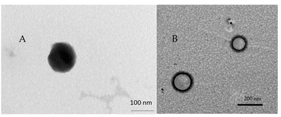 Transmission electron micrographs of LP-TQ showed vesicles with multi-layer structures (Figure 1) clearly distinct, with spherical shapes and nanosized dimensions, as suggested by DLS analysis. TEM of LP-TQ-HA showed a black a fluffy layer around the liposomes (Figure 1), not visible in LP-TQ, which confirms the deposition of the HA coating, in a similar manner to the results reported by several authors [39,40,41].