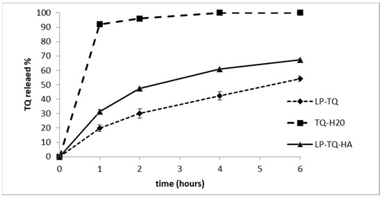 The dialysis bag method was employed to investigate the release of TQ from liposomes. The test was carried out in sink conditions and PBS (pH 7.4); 0.5% of Tween 80 was used as a release medium. The release profile of TQ from LP-TQ and LP-TQ-HA at 37 °C was compared with the release of a saturated aqueous solution (Figure 2).