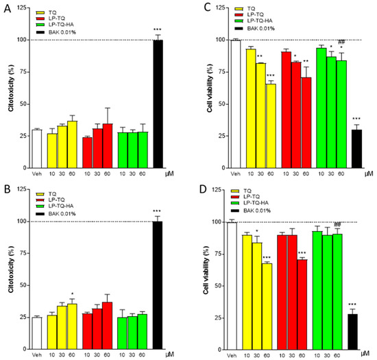 The cytotoxicity of TQ, both free and formulated in liposomes, was assessed with LDH and MTT assays, where 0.01% benzalkonium chloride (BAK) was considered the positive control. Figure 3 shows that at 15 min of incubation of the conjunctiva cells with free TQ or TQ-loaded liposomes, there are no changes in LDH levels (A), while 1 h of incubation of the same cells with 60 µM TQ induces a significant increase in LDH (B). The MTT assay of Figure 3 shows that free TQ already induces cellular distress at 15 min of incubation at concentrations of 30 and 60 µM; we observed similar effects with LP-TQ at the same concentrations (C). On the other hand, LP-TQ-HA does not show any toxicity in conjunctiva cells in any doses tested for 15 min and shows reduced toxicity at concentrations of 30 and 60 µM at the exposure time of one hour versus TQ (D).