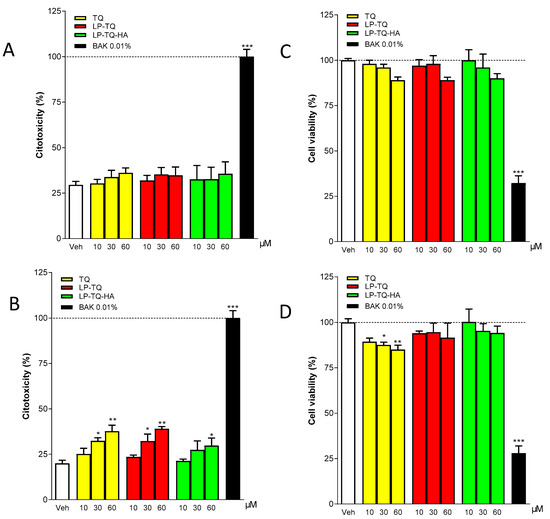 Evaluation of LDH and MTT assay in the human corneal epithelial cells (HCE-2) after 15 min (A,C) and 1 h (B,D) of incubation with TQ, LP-TQ, or LP-TQ-HA components. Data are expressed as percentages of the maximum degree of cell death BAK (A,B) and as percentages of the maximum cell viability (Veh) (C,D); they represent the mean ± standard error of the mean of at least 3 experiments performed in triplicate. * p < 0.05, ** p < 0.01, and *** p < 0.001 vs. Veh.