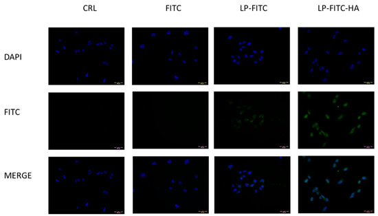 In vitro release tests were also performed on the fluorescent formulations to evaluate the stability of FITC formulated in liposomes during the cellular experiments. The in vitro tests were carried out for 2 h at 37 °C. After 2 h, the percentage of FITC released from LP-FITC was 7%, while that from LP-FITC-HA was 8%, indicating that both systems, during the in vitro tests, were stable.
