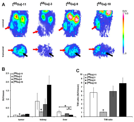In vivo PET imaging of [68Ga]-11, [68Ga]-3, [68Ga]-9 and [68Ga]-10 accumulation in B16-F10 tumor-bearing mice 10 ± 1 days after tumor cell inoculation and 70 min after intravenous injection of the radiotracers (A panel). Red arrows: B16-F10 tumor; black arrows: liver. (B,C) panels: quantitative SUVmean and tumor-to-background (muscle) ratio (T/M) analysis of tracer uptake in mice (n = 3/radiopharmaceutical) 70 min post-injection. Significance level: p ≤ 0.05 (*). SUV: standardized uptake value; T/M: tumor-to-muscle ratio. SUV values are presented as mean ± SD.