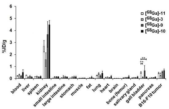 Ex vivo biodistribution studies. Ex vivo assessment of the accumulation of [68Ga]-11, [68Ga]-3, [68Ga]-9, and [68Ga]-10 in experimental subcutaneous B16-F10 tumors 90 min after tracer injection and 10 ± 1 days after tumor cell inoculation. %ID/g tissue values are presented as mean ± SD. Significance levels: p ≤ 0.05 (*) and p ≤ 0.01 (**).