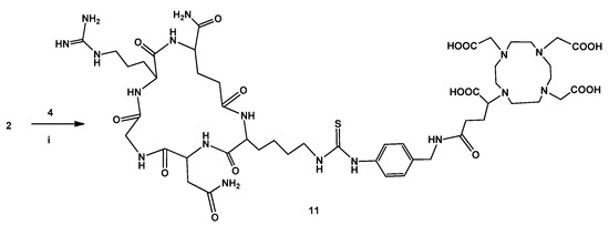 To investigate the effect of the structural changing on the in vivo performance of the radioglycopeptides we carried out the synthesis of the DOTAGA-cKNGRE (11) as a reference. Thus, p-NCS-Bn-DOTA-GA (2) was coupled with cKNGRE (4) in the presence of triethylamine in dimethylformamide and water (Scheme 4).